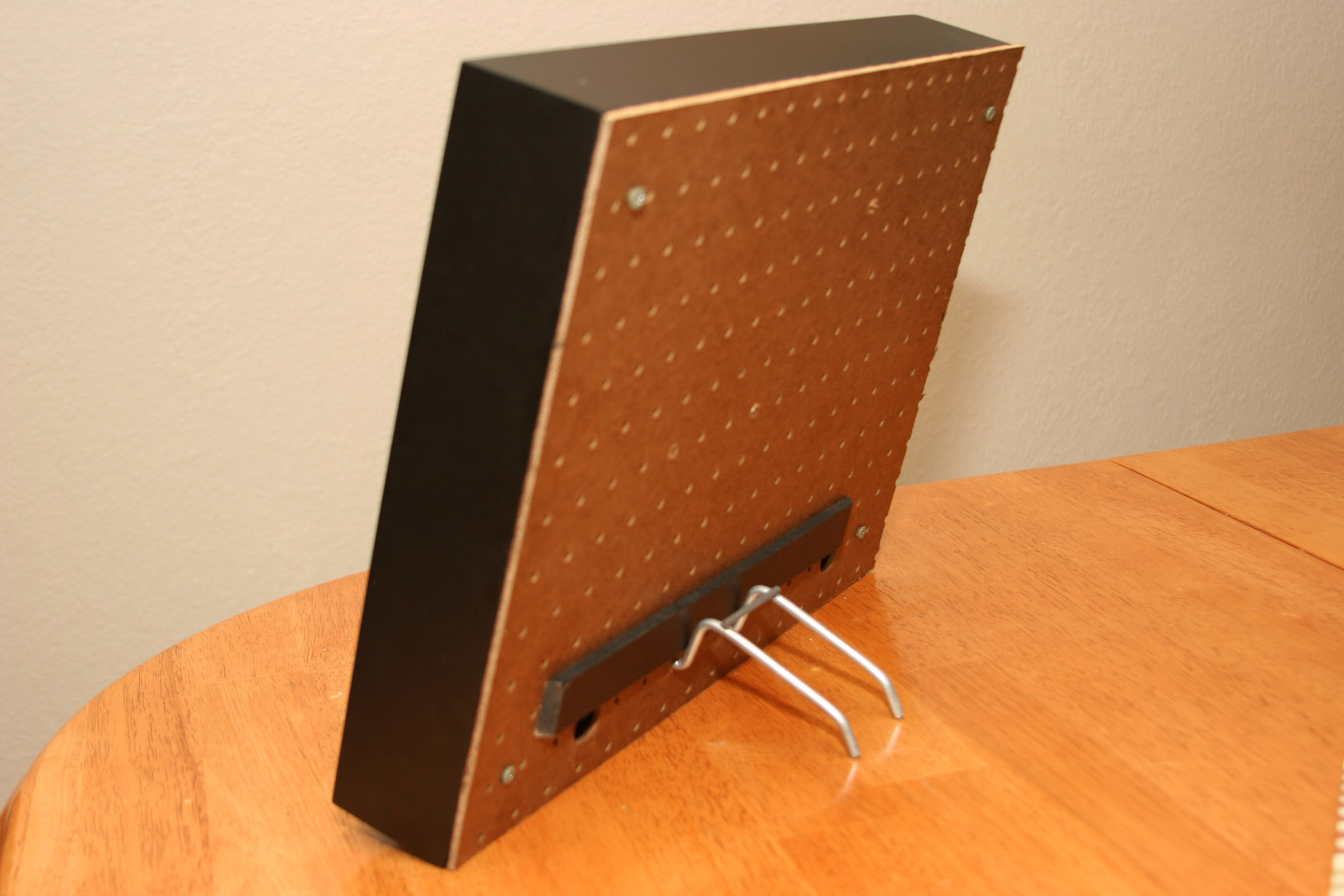 Because pegboard was used for the backing, I was able to use a hanging tool that fits securely in the back enabling the frame to be set at an angle. |